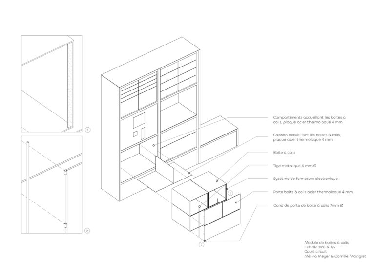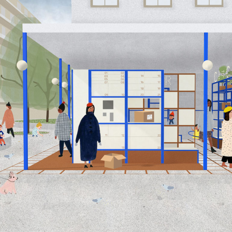 La thématique traitée s’axe autour de la problématique des livraisons de colis au sein du quartier. Comment faire de cet espace déshumanisé un lieu de rencontres qui considère la notion d’échange dans ses formes les plus diverses : lien social, don, prêt, marchandises (colis). Un programme qui était jusqu’ici mal intégré dans le tissu social urbain devient ainsi un lieu de croisement qui renforce l’aspect communautaire du quartier et de ses habitants. La construction d’une maquette au 1/10° a par suite permis de retranscrire l’espace dans un casque de réalité virtuelle afin de créer une expérience immersive pour le public au sein des nouveaux espaces crées.