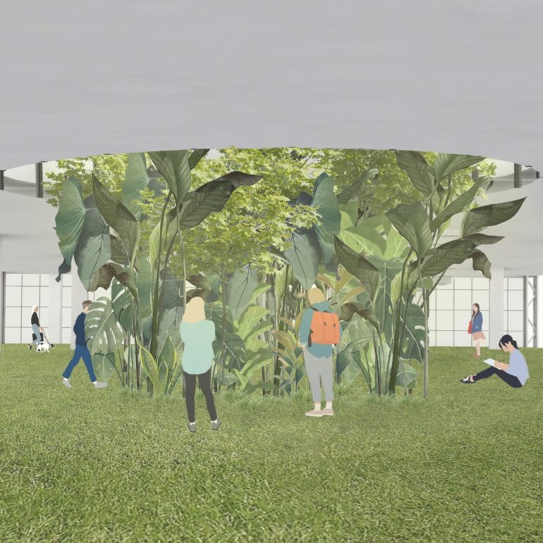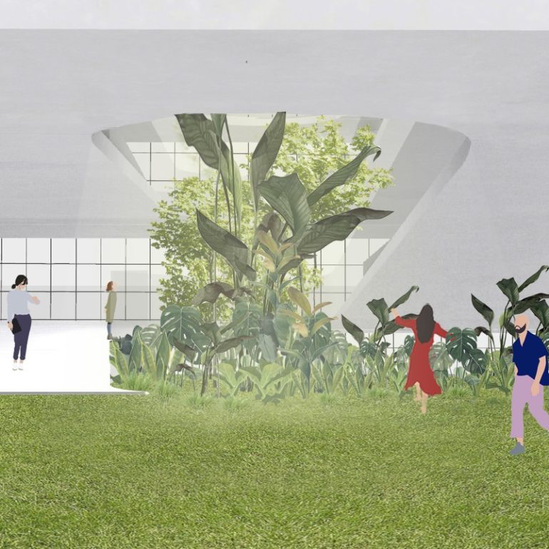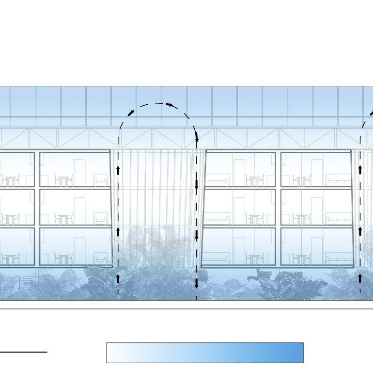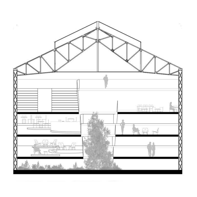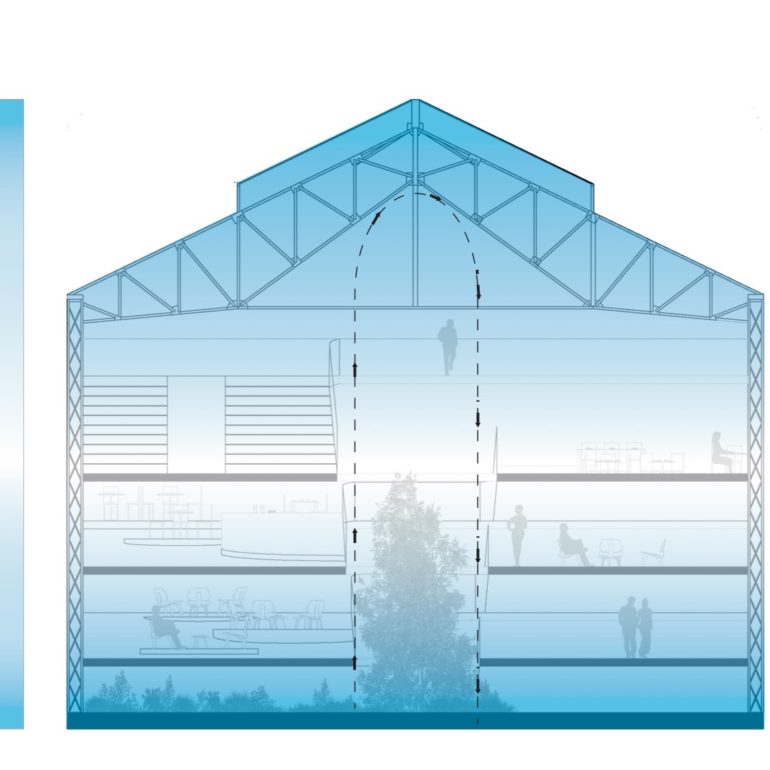 Le projet Aven se penche sur la problématique sanitaire liée au pollen. Les allergies causées par le pollen sont devenues un phénomène sanitaire de plus en plus préoccupant, en effet selon l’OMS, d’ici 2050 près de 50%de la population sera touchée par les allergies. L’espace public est organisé autour d’un puit de lumière qui permet la diffusion de la lumière et de l’humidité dans l’espace. Les étages se déploient comme une hélice, un chemin ininterrompu où l’on passe naturellement d’un étage à l’autre. Le programme d’habitation s’organise sur 3 étages, 3 puits de lumière coniques qui percent les différents étages afin d’alimenter le rez-de-chaussée et les appartements en lumière naturelle qui provient de la toiture vitrée. Ces puits de lumière ont une pente plus forte sur la face exposée sud et moins importante au nord afin d’exploiter au maximum et de façon efficace la lumière. Donner aux puits de lumière une forme conique permet également à l’eau qui condense au contact des surfaces vitrées plus froides, d’être évacuée et de retomber au sol pour alimenter de nouveau la végétations du rez-de-chaussée. La « forêt » présente du rez-de-chaussée peut alors librement grimper au centre de ces puits offrant au habitant l’étonnante impression d’habiter au dessus d’une canopée.